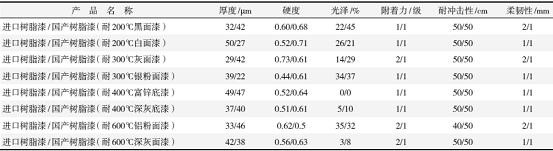 耐热性能:在喷砂钢板(厚度为 0.8~ 1.2 mm ,尺寸 100 mm × 120 mm )上喷涂耐高温涂料后,在恒温恒湿室[( 25 ± 2 )℃,( 57 ± 2 ) % ]自然干燥 2 d ,放入马弗炉中,调到相应温度; 200 h 后取出样板,冷却至室温,用放大镜观察涂层表面状况,如无龟裂、起泡、脱落现象,即表明涂层耐热性良好 [ 4-5 ] 。冷热交变性能:用坩埚钳直接将涂装后的样板从高温马弗炉中取出,立刻放入常温自来水中 2 h ,取出晾干。然后再放入马弗炉中,升温到取出时的温度,保持 4 h ,再高温取出。反复多个周期,如涂层完整(无龟裂、起泡、脱落现象),即表明涂层耐冷热交变性能良好 [ 4-5 ] 。按相应国标测试其他指标:按 GB/T l720 — 1979 测试附着力;按 GB/T 1731 — 1993 测试柔韧性;按 GB/T 1732 — 1993 测试抗冲击性;按 GB/T 1728-1979 测试干燥时间;按 GB/T 1733 — 1993 测试耐水性;按 GB/T 1763 — 1979 测试耐盐水性;按 HG2 — 1611 — 85 测试耐油性。